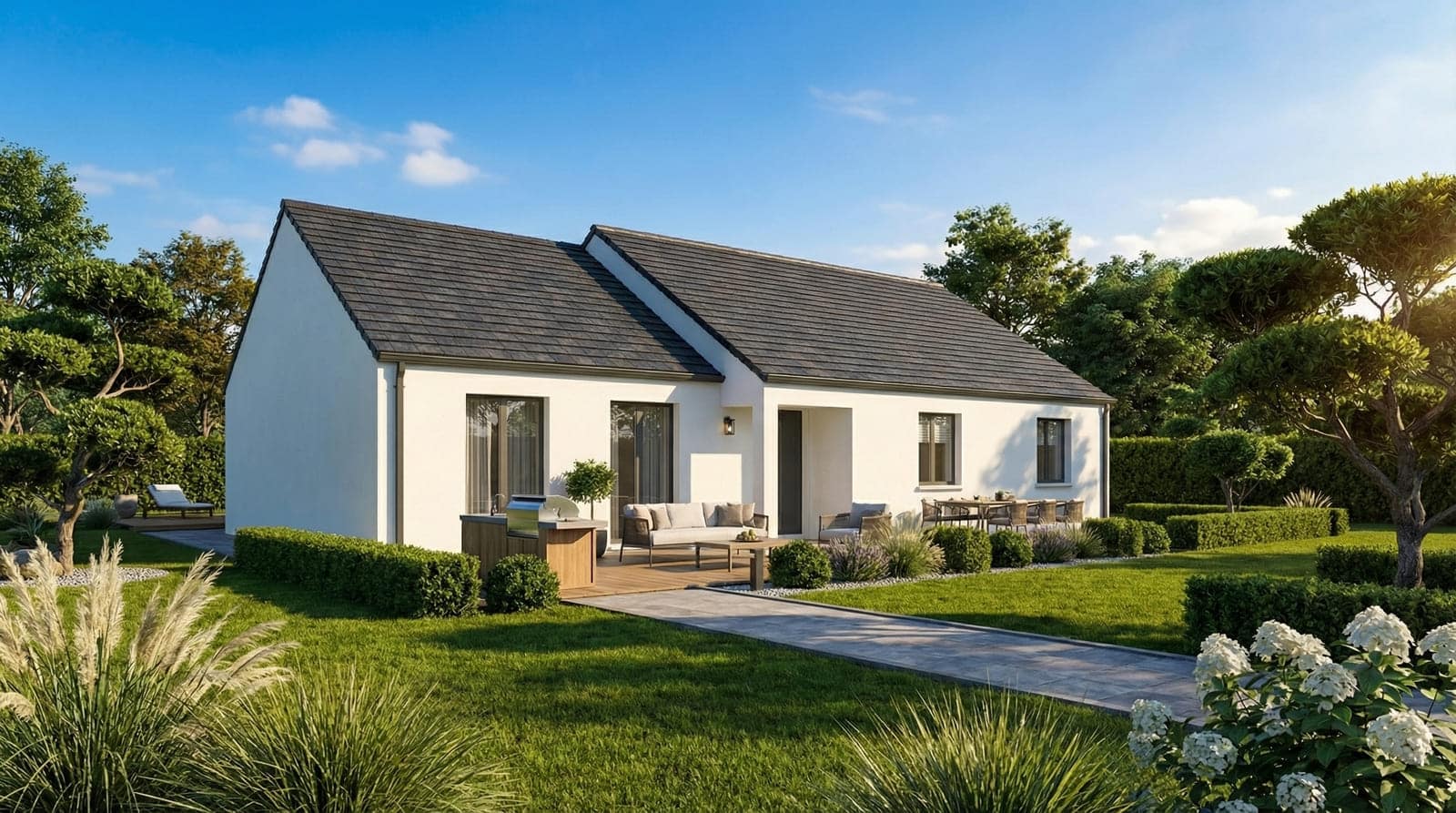 Constuire le modèle Pernes est un bon choix si vous souhaitez devenir propriétaire d’une belle maison neuve à prix doux. Cette jolie demeure traditionnelle de plain-pied se décline en trois versions différentes de 87,5 à 108m². Elle possède une avancée de toit qui vient protéger les portes-fenêtres de la façade avant ainsi que la porte d’entrée. Cela lui confère une grande élégance tout comme son enduit bi-tons. Elle a tous les atouts pour vous séduire et vous convaincre de la bâtir.