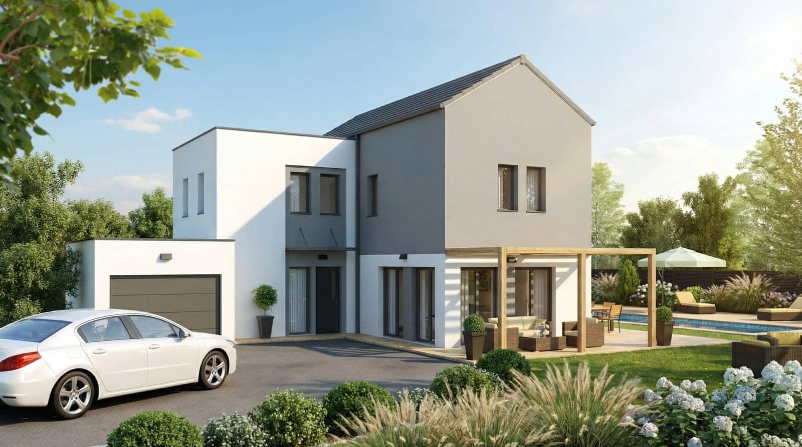 Munie de sa pergola et son enduit bi-ton moderne, la Saulty a vraiment du caractère ! Vous pourrez d’ailleurs personnaliser l’enduit en fonction de vos préférences. Peut-être aurez-vous aussi le désir de bétonner la terrasse. Vous souhaiterez probablement l’équiper en domotique également. De nombreuses options sont disponibles afin de vous permettre de bâtir la demeure qui vous convient le mieux. Opter pour cette maison qui, en plus, est basse consommation RT2012, est finalement un choix très rationnel. Elle vous plaît ? Prenez contact avec nous ! Commençons à poser aujourd’hui les fondations de votre maison de demain. Vivez votre rêve !